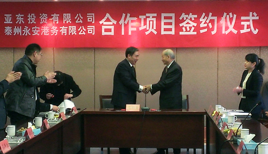 為配合亞泥(中國)所屬江西亞東水泥有限公司五、六號(hào)線投產(chǎn)后,新增600萬噸水泥之銷售布局,亞泥(中國)與泰州港務(wù)集團(tuán)合作,投資約2億人民幣設(shè)立泰州亞東建材有限公司,并于4月11日舉行簽約儀式,由亞泥(中國)張才雄副董事長與泰州港務(wù)集團(tuán)蔡年生董事長代表簽訂,現(xiàn)場氣氛友好熱烈。