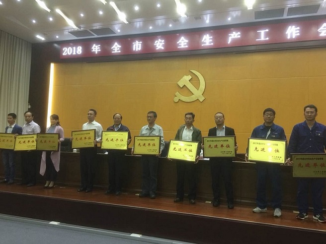 九江市人民政府于2018年4月23日在市政府會(huì)議室表彰了“2017年度全市安全生產(chǎn)目標(biāo)管理 先進(jìn)單位”,全市水泥行業(yè)僅江西亞東榮獲該榮譽(yù),并由九江市市政府代市長(zhǎng)頒獎(jiǎng),我公司總經(jīng)理領(lǐng)獎(jiǎng)。